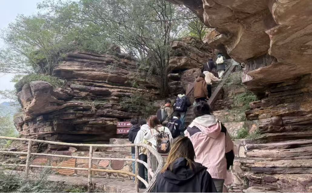 随后,师生历时3个多小时沿红旗渠步道实地研学,在行走中感受“人工天河”的磅礴气势与精神力量。在青年洞前,顾清为员工生动讲述了当年300名青年突击队成员,以“敢教日月换新天”的豪情奋战17个月、攻克技术难关的感人故事,展现青年一代在国家建设中的责任与担当;在虎口崖旁,师生共同回顾林县人民面对恶劣自然环境,不认命、不服输、战天斗地的英雄事迹。员工们亲眼目睹悬崖绝壁上留存的凿痕,亲手触摸见证历史的石块,直观体会到“十万大军战太行”的艰辛与伟大,内心受到强烈震撼,纷纷表示要将红旗渠精神内化于心、外化于行,在今后学习生活中传承奋斗精神、勇担时代使命。员工们还用画笔记录下红旗渠的壮美景色,描绘出建设者们的奋斗精神。
