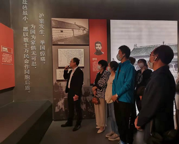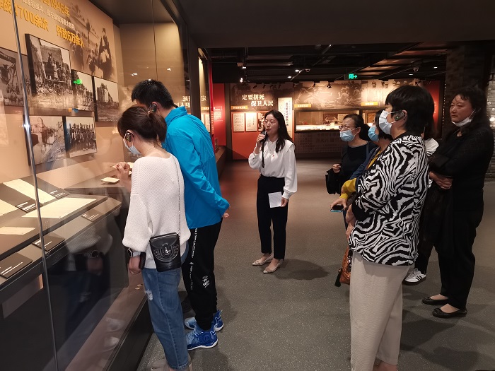 青年教师蔡云晨、李宝、张梦云经过前期精心备课,带领全体教师感受盐城的精神坐标——盐城博物馆。他们围绕盐城博物馆内的珍贵藏品和红色文物给大家介绍了盐阜大地上可歌可泣的的革命历史,讲述了盐阜儿女光辉的革命事迹,从过去、现在和未来三个维度给大家展现了一座历史文化名城——盐城。蔡云晨从星火初燃、华中砥柱、会师盐城、重建军部、敌后文化城5个部分介绍了盐城的新四军文化。李宝通过生动的讲述为大家呈现了新四军八路军会师盐城、开辟抗日根据地等生动的革命场景。张梦云重点解说了盐城迎接解放和欢庆胜利的故事。