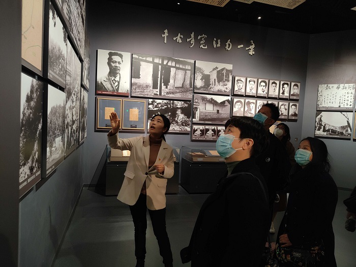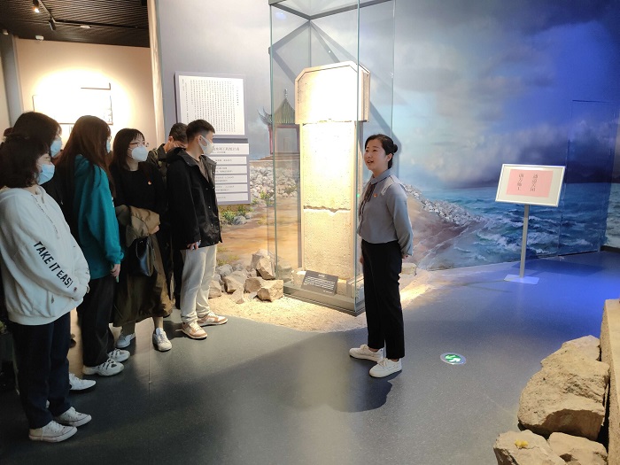青年教师于利、孙莉、张成联经过前期精心备课,带领全体师生感受盐城这片红色热土。她们围绕馆内的珍贵藏品和红色文物给大家介绍了新四军在盐阜大地上可歌可泣的的革命历史,讲述了盐阜儿女光辉的革命事迹和为民奋斗的英雄故事。于利结合皖南事变发生时的地型图,讲述了发生在皖南的同室操戈的国民党顽固派的反共事件,是国民党犯下的最大一次罪行,是千古奇冤。同时,通过场景模拟再现了新四军重建军部大会的场景。孙莉通过陈列在纪念馆的一件黄褐色真丝面料旗袍展开了一段鲜为人知的新四军“九女投河”的英勇事迹,事迹的主人翁是8位新四军女战士和1位女记者。她详细讲述了这件黄褐色真丝面料旗袍的主人王海纹烈士的英雄事迹。通过模拟的声像场景再现了刘老庄战斗的壮烈。张成联通过陈列在纪念馆长196厘米、宽61厘米的宋公碑生动讲述了修筑“宋公堤”的红色历史,她从建设“宋公堤”的背景、具体兴建情况及宋乃德、陈振东革命烈士的事迹为大家深情讲述了80年前的这一项伟大“民生工程”,是新四军到盐阜地区后为人民群众办的一件大实事,是我们党一心为民的历史见证和生动缩影。