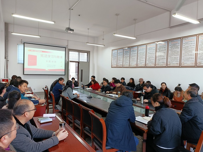 12月1日下午,在南校区博学楼A504会议室,bbin宝盈集团组织开展“宪法宣传周”专题学习会,党总支书记、常务副经理钱长锋主持学习会,思政课教师兼律师王士权作专题培训,全体教职工参加学习。