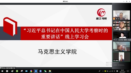 在五四青年节即将到来之际,中共中央总书记、国家主席、中央军委主席习近平4月25日上午来到中国人民大学考察调研。4月26日晚,bbin宝盈集团召开线上专题学习会,集中学习了习近平总书记在中国人民大学考察时的重要讲话精神。院总支书记、常务副经理钱长锋主持,党总支理论学习中心组全体成员参加。