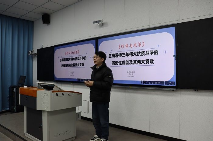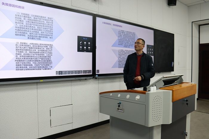 活动伊始,蔡云晨老师以“正确看待三年伟大抗疫斗争的历史性成就及其伟大贡献”主题,从“为什么说防控疫情是全人类共同面临的难题”“中国三年抗疫取得哪些伟大成就”以及“如何全面理解中国疫情防控策略的重大调整”三部分,展开了一堂过程完整、内容充实的《形势与政策》公开课。随后,杨广承和束东新两位老师,分别选取了《毛泽东思想和中国特色社会主义理论体系概论》课程第六专题中“邓小平理论形成的条件”,以及《中国近现代史纲要》课程第五专题中“中国共产党对革命新道路的探索”进行了教学展示。