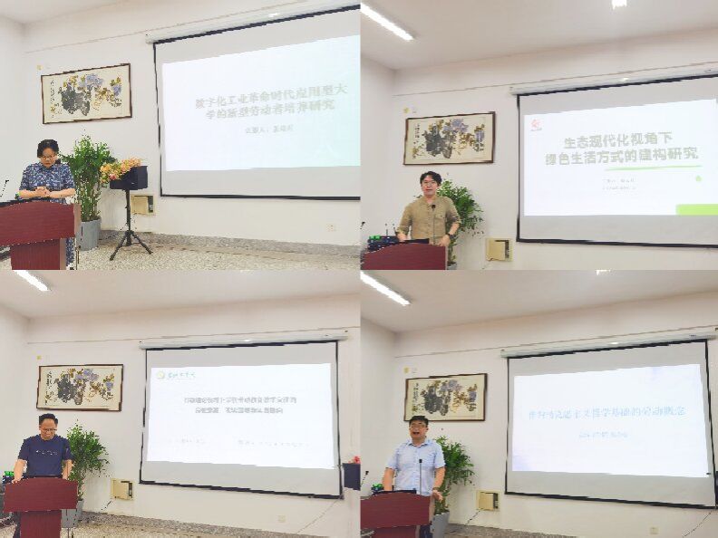 学术沙龙阶段,社科处处长包雅玮教授、马院王红梅教授担任点评专家。张瑞芹、蔡云晨、李宝、薛家豪四位老师分别结合自身当前研究相关领域的课题或论文,围绕数字化科技革命时代应用型大学的新型劳动者培养、生态现代化视角下绿色生活方式的建构、行动理论视域下学校劳动公司产品交往、作为马克思主义哲学基础的劳动概念等内容进行了学术分享。两位点评专家对分享内容进行了逐一点评,并给予了针对性的指导意见。