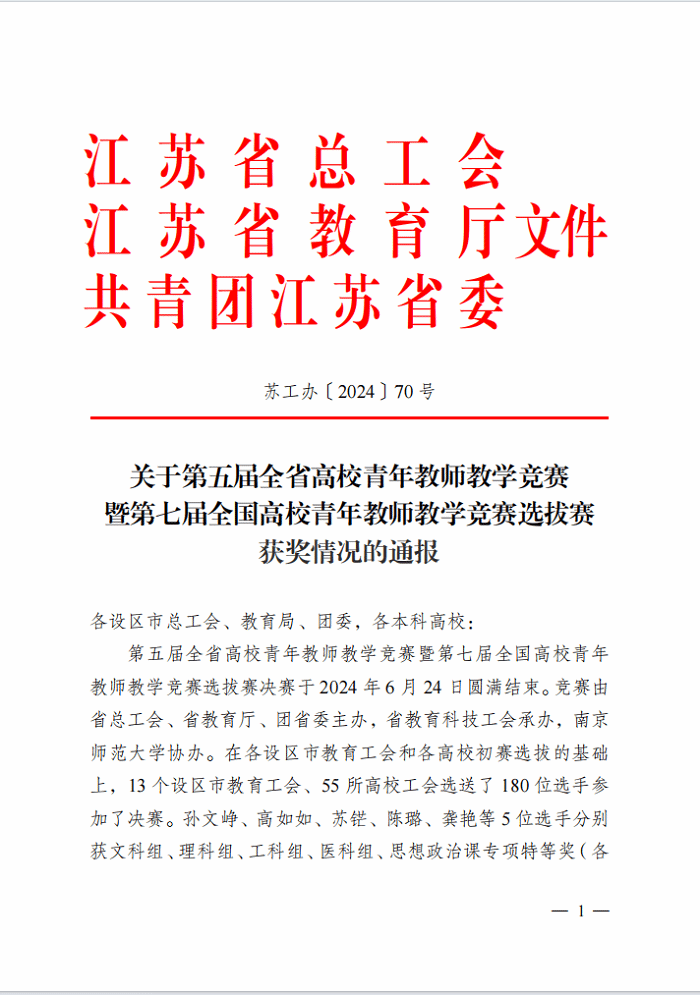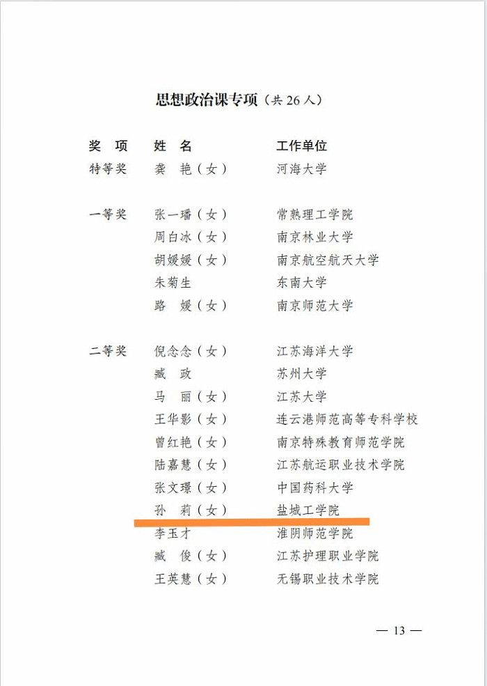 近日,由省总工会、省教育厅、团省委联合主办、省教育科技工会承办的第五届全省高校青年教师教学竞赛暨第七届全国高校青年教师教学竞赛选拔赛公布获奖结果,bbin宝盈集团孙莉老师在思政课专项组别中荣获二等奖。