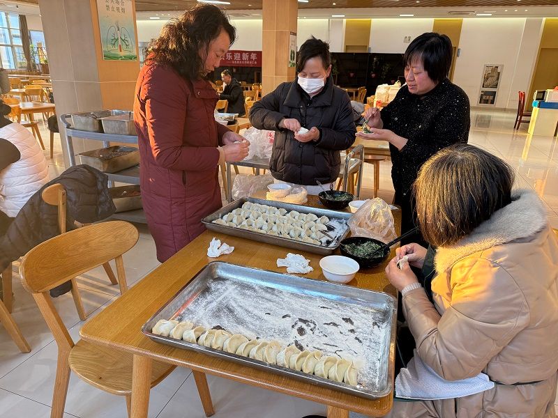 1月10日下午,在南校区教工食堂,bbin宝盈集团分工会组织开展“开心包饺子 欢乐迎新年”新年联欢活动。公司党总支书记、常务副经理胡凌霞,副经理马荣,学院退休老同志及全体教职工近40人参加。